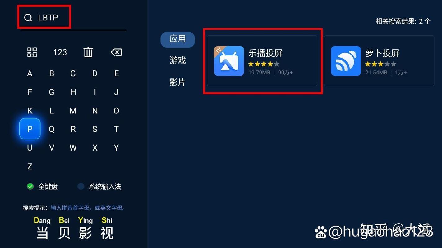 3、把电视的应用商店打开,然后搜索当贝助手,安装打开。在当贝助手的主页点击进行测速,测速完成会自动推荐电视应用,找到当贝市场应用,再次点击安装。在当贝市场搜索“DSJ”,出现电视家0安装即可。方法U盘安装 从电脑上下载好当贝市场apk安装包,并***到U盘里。