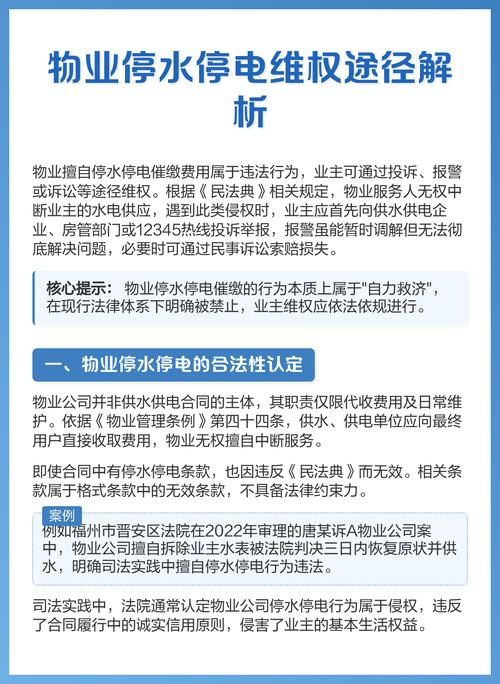 2、首先,向所在地的物业管理行政主管部门(多为住建局物业管理科)进行投诉,或致电 12345 政务服务热线咨询投诉电话;其次,亦可寻求业主委员会协助,共同协商解决方案。若以上途径均未能解决问题,您可搜集相关证据,依法向***提***讼,请求物业公司恢复水电供应,并承担相应法律责任。