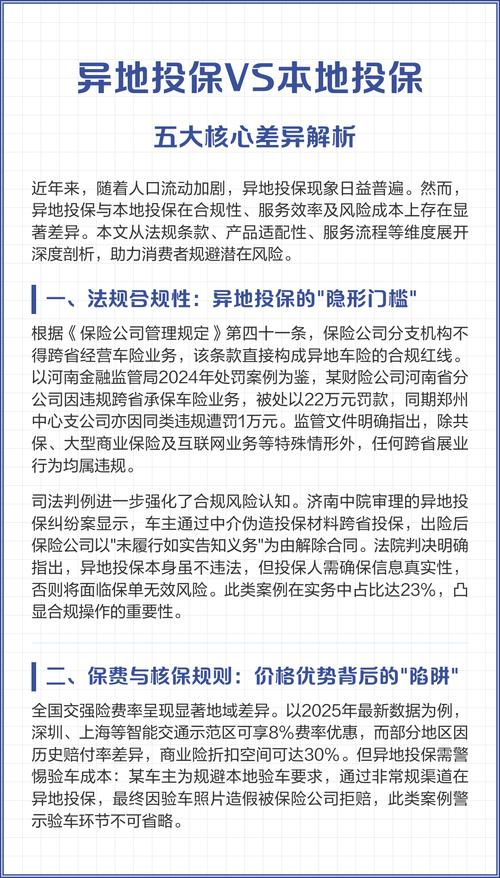 1、异地投保的风险 信息不对称风险:异地投保时,投保人可能无法充分了解保险公司的信誉、经营状况以及产品的具体条款和细节。这可能导致投保人在不了解全部信息的情况下做出决策,从而增加风险。服务不便风险:异地投保后,如果投保人需要咨询、理赔或进行其他服务操作,可能会面临地理距离带来的不便。