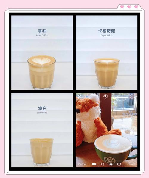 咖啡区别 卡布奇诺:由意式浓缩咖啡、牛奶和奶泡按照1:1:1的比例构成,表面通常有一层厚厚的奶泡,有时还会撒上肉桂粉做装饰。口感上,咖啡、牛奶和奶泡交织,咖啡香气混合奶味,味道丰富。拿铁咖啡:由意式浓缩咖啡和牛奶按照1:2的比例构成,表面通常有漂亮的拉花装饰,但没有奶泡。