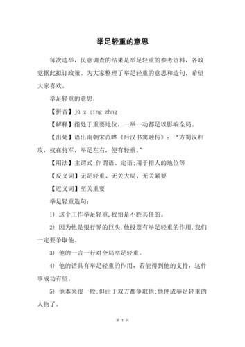 明确答案:举足轻重是指处于重要地位,一举一动都足以影响全局。详细解释:举是动作,意为行动,足重表示分量足够重。因此,举足轻重的字面意思是一行动就足够重要。