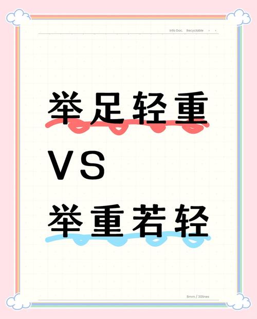 举足轻重是指处于重要地位,一举一动都足以影响全局。举重若轻形容某人做某些事情或处理问题时,能力强大到能轻松胜任重要任务,不费力气。举足轻重: 字面意思:“举”是行动,“足重”表示分量足够重,因此“举足轻重”的字面意思是“一行动就足够重要”。
