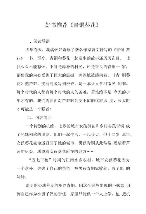 1、《青铜葵花》读书笔记 《青铜葵花》是一部令人动容的小说,它以细腻的笔触描绘了两个孩子——青铜与葵花的感人故事。以下是我对这部作品的几点感悟:故事梗概 青铜与葵花,两个原本陌生的孩子,在命运的安排下成为了好朋友。他们一起生活,在苦难中共同成长,结下了深厚的友谊。