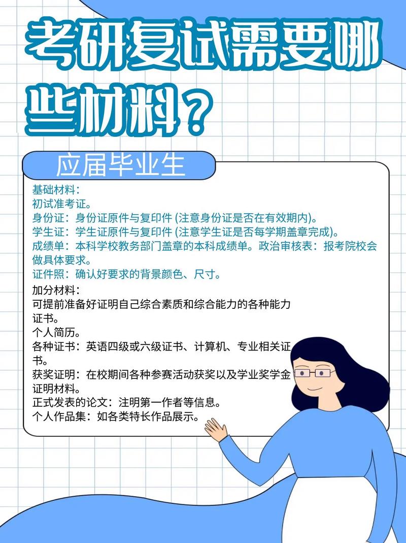 1、本科成绩单及复印件:需加盖学校公章,复试时单独提交至各学院。加分证书:如六级证书、操作技能证书等。一寸彩色免冠照片:面试体检时可能需要。撰写材料:面试简历、自我介绍、给导师的信件等,需为每位老师准备一份。往届毕业生 身份证明:初试准考证、本人有效身份证原件及复印件、毕业证和学位证原件及复印件。