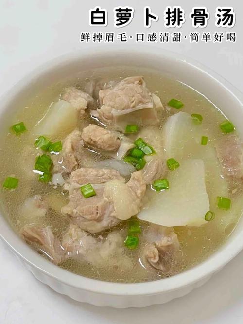 白萝卜排骨汤的做法如下:用料:- 白萝卜500克 - 排骨420克 - 枸杞8克 - 盐8克 - 姜片6片 - 料酒10克 - 清水4000克 步骤: 排骨清洗干净。 白萝卜清洗干净去皮,切块。 将清洗干净的排骨放入砂锅中,加入姜片、料酒和清水,大火烧开(可在砂锅上方放置一个木铲,防止汤溢出)。