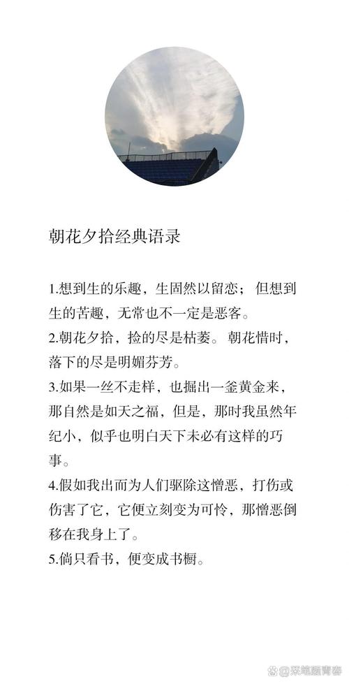 2、有关朝花夕拾的好句好段整理如下,可供参考。错过了太阳,我不哭泣,否则,我将错过月亮和星辰。失败也是一种收获,生活中最得要的是有一份十足的勇气和一个创业的胆量。这堵石壁似摩天大厦仰面压来,高得像就要坍塌下来咄咄逼人。我们应该从失败中、从成功中、从生活品味出人生的哲理。