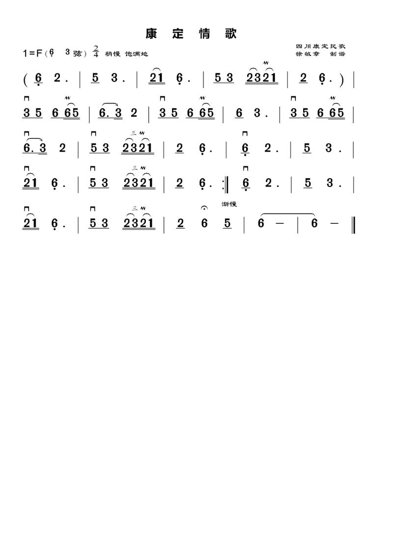 4、《康定情歌》又叫《跑马溜溜的山上》,是四川康定地区具有代表性的汉族民歌,经江定仙编曲、由喻宜萱1947年4月19日在南京演唱。此后《康定情歌》在全国流传,而且声名远扬海外,得到各国人民的喜爱。《康定情歌》每段有两句歌词、三句旋律。