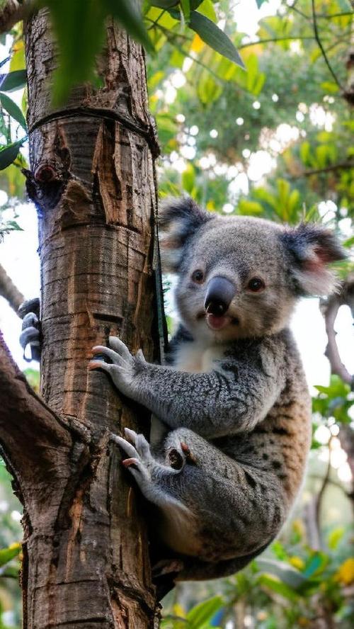 考拉是澳大利亚的国宝级动物,因其可爱的外表和树栖的生活方式而广受欢迎。考拉主要分布于澳大利亚东南部的干旱森林中,以桉树叶为食。成年考拉体重约在8-10公斤之间,而幼崽出生时仅为5克。它们在母体的育儿袋中哺乳六个月,之后继续在母背上成长。考拉的寿命可达20年,夜行性,且喜欢独处。