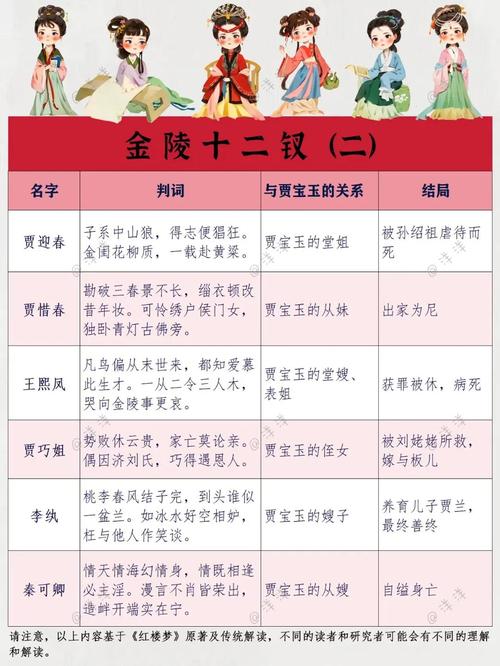 2、金陵十二钗副册:香菱、薛宝琴、尤二姐、尤三姐、邢岫烟、李纹、李绮、夏金桂、秋桐、小红、龄官、娇杏;其中副册之中的香菱、尤二姐、秋桐、娇杏是妾;其余之宝琴、三姐、岫烟、李纹、李绮、金桂是亲戚,而小红因为贾芸,龄官因为贾蔷之故,也都可归入亲戚之行列;又副册之十二人皆为比较重要之大丫鬟。