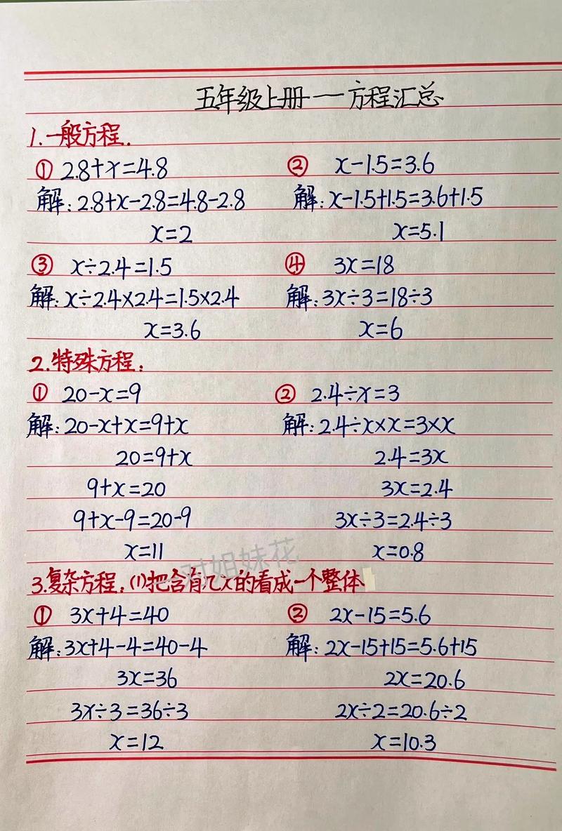 5、方程:指含有未知数的等式,表示两个数学式(如两个数、函数、量、运算)之间相等关系的一种等式,使等式成立的未知数的值称为“解”或“根”,求方程的解的过程称为“解方程”。方程具有多种形式,如一元一次方程、二元一次方程、一元二次方程等等,还可组成方程组求解多个未知数。