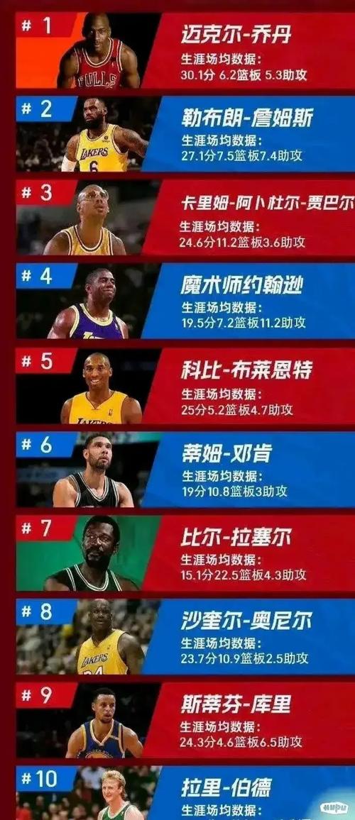 NBA历史前100球员的排名一直是球迷热议的话题,综合荣誉、数据、影响力等因素,这里给出一个相对公认的版本(注:排名见仁见智,仅供参考): 乔丹毫无悬念第一,6冠+6FMVP+5MVP+10得分王,攻防一体,统治90年代。 詹姆斯坐二望一,4冠+4FMVP+4MVP,历史总得分王,巅峰期超长待机。