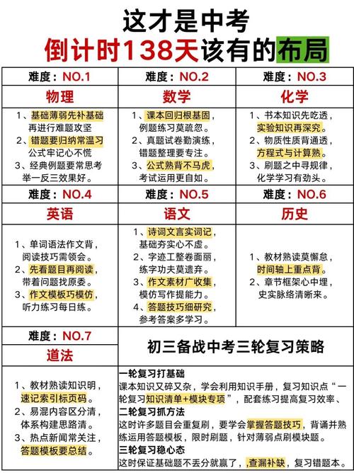 3、避免过度学习导致的疲劳,合理安排学习与休息时间。适当的放松有助于恢复精力,提高学习效率。坚持预习与复习:预习:九年级学习中不可或缺的一环,有助于提前了解新知识,提高课堂学习效率。复习:中考备考的关键,通过复习巩固所学知识,减轻考前压力。遵循以上方法,初三学生可以更高效地提升学习成绩。