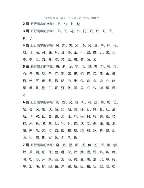 6、《康熙字典》中五行属水且笔画为17画的字有瀷、濉、灏、醢、潚、澹、禧、濠、霜、霞、繁、濛、濯、朦、臂、辫、蟊、貔、缥、鳅、霙、鼣、鮛、鮢、鮤、鮨、鲛、鲑、鮡等。 瀷(yì):指水流貌,也可形容水的清澈。 濉(suī):水名,在中国安徽省北部。