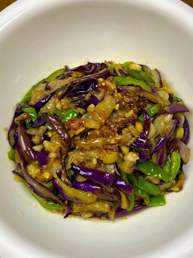 5、下茄子中火翻炒,炒到茄子变软、边缘微焦(约3分钟)。加入青椒,淋入生抽+蚝油+少许糖,大火快速翻炒均匀(糖能中和茄子的涩味)。最后尝味补盐(腌茄子时已加盐,注意别过咸)。升级小贴士 加一勺豆瓣酱:喜欢酱香的可以在爆蒜时加半勺豆瓣酱,味道更浓郁。
