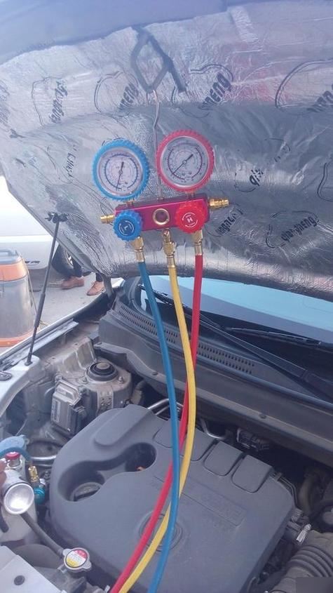 2、空调合电开机,并打开制冷剂罐的阀门。再打开表阀两通阀的阀门。然后开始加制冷剂,观察表的压力逐渐上升。在表针上升到0.5~0.6MPa时,说明加注制冷剂量合适,然后可以关掉制冷剂罐的阀门和表阀的阀门,到此即完成加装制冷剂的过程。