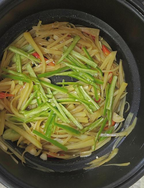 4、炒土豆丝:干辣椒炒香后,放入切好的土豆丝,大火快速翻炒。同时加入1茶匙生抽,翻炒均匀,使土豆丝均匀上色。加入青椒丝:土豆丝炒至七八成熟时,放入切好的青椒丝,继续大火翻炒。调味:炒至青椒丝和土豆丝即将熟透时,调入1茶匙食盐,快速翻炒均匀。