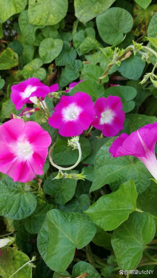 从远处观望,牵牛花的叶子呈现出爱心形状,表面光滑,与细长的茎干相接处常常孕育着小花蕾。 近距离观察,可以发现茎干上覆盖着一层细腻的白色绒毛;牵牛花的花朵通常是粉红色与白色相间的条纹状,中心有大约五六根白色的花蕊。