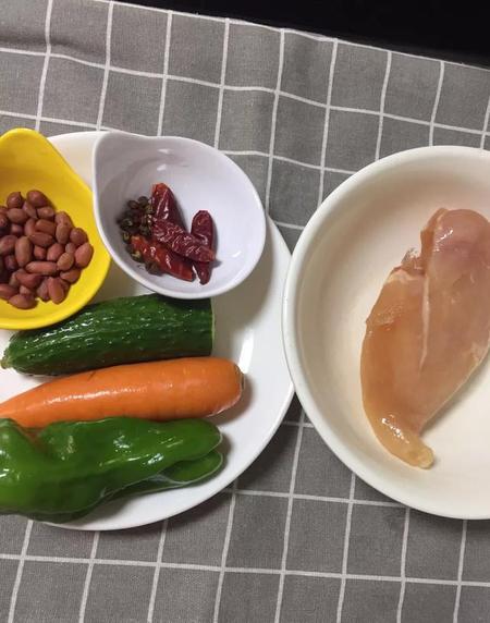 食材:鸡胸肉、胡萝卜、黄瓜、青椒、花生米、葱节、豆瓣酱、生姜、蒜瓣、干辣椒、花椒