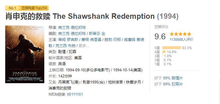《肖申克的救赎》可以说是当今世界上评分最高的电影,在国外,它被IMBD选为第一电影;在国内,它在豆瓣的评分是9.6分,也是第一;在爱奇艺,腾讯视频等平台上,它的评分都是在9分以上的,评价相当高,若按评分来说,它当之无愧是第一。