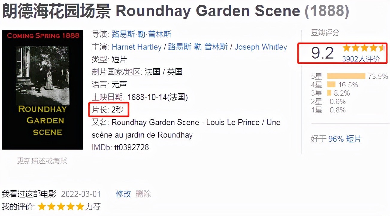 此片时长虽然很短,但也是公认的电影,而且在豆瓣网上,有近4000观众打出了9.2的高分。评分如此之高,主要就是因为它的时长很短,一个小时可以观看许多遍。