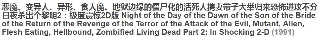 据显示,这部影片的英文名是《Night of the Day of the Dawn of the Son of the Bride of the Return of the Revenge of the Terror of the Attack of the Evil, Mutant, Alien, Flesh Eating, Hellbound, Zombified Living Dead Part 2:In Shocking 2-D》,其中包含41个单词,总共168个字母,只是念都要念“半天”。