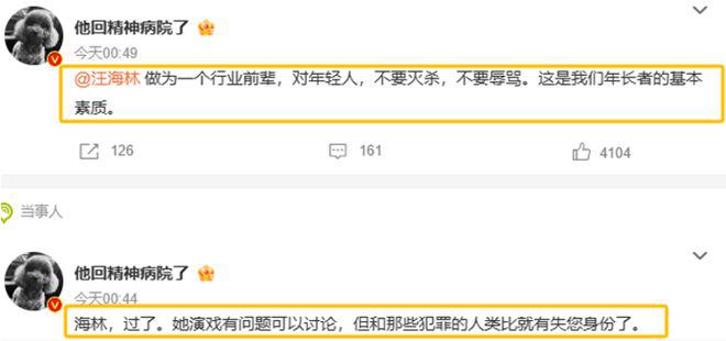 当即回怼汪海林道:" 海林,过了。她演戏有问题可以讨论,但和那些犯罪的人类比就有失您身份了。"