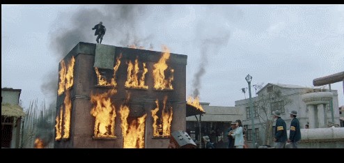 同一时间,阿德已经换好女装站上窗台,正在犹犹豫豫,可洪金宝却在楼下催他快点跳,这一幕“致敬”了成龙的《A计划》,众所周知,当时拍钟楼那场戏,最先试跳的是替身火星,后来轮到成龙,他也是犹豫,最后洪金宝在下面骂街,才成就了那个经典镜头。