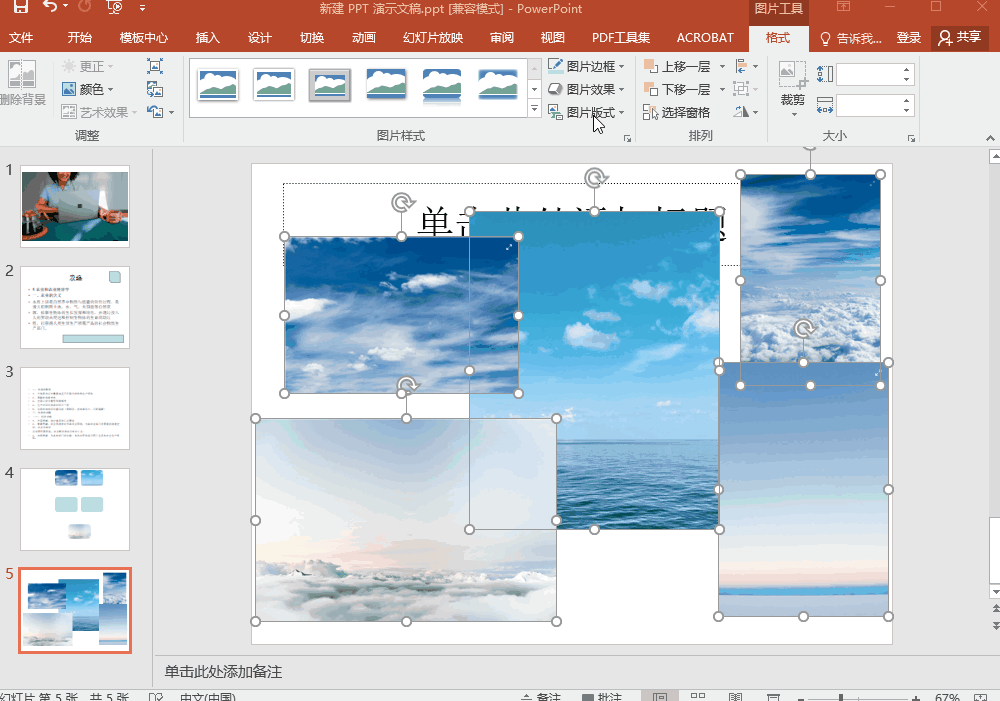 但我们其实也可以借助“PPT”自带的“图片版型”工具,快速归纳统一图片的大小与排版结构与位置。