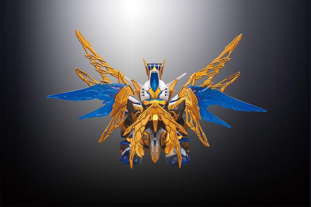 脑壳后面还有与本体蓝色不同的另一种蓝色作为分色细节,不知道到时候实物是用贴纸还原呢?还是根本就是官图无限美呢?背后的翅膀部分非常好看,在原有背包的造型上加入了相当复杂的刻线细节与镂空造型,比较可惜的是最大块的翅膀并没有采用双面金色外甲包裹。