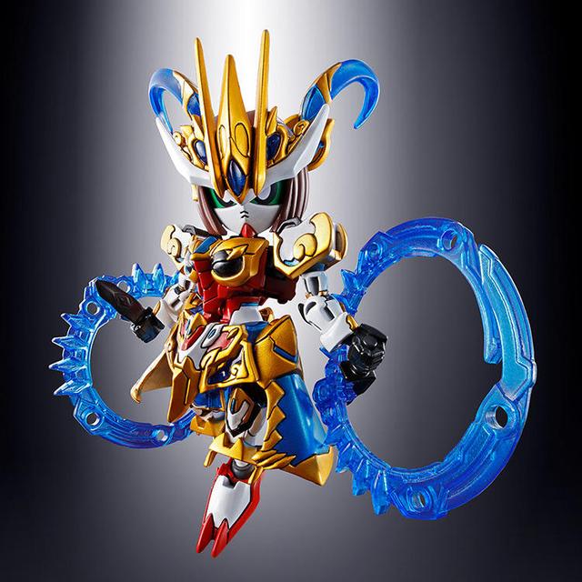 诸葛亮的招牌武器羽扇则是采用透明零件加上金色外装,羽扇的尖端部分还加入了可动机构,能实现展开与闭合两种状态,整体的刻线细节也相当丰富。