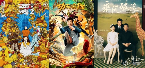 2017年,徐克、周星驰带来13年春节档冠军降魔篇的续作《西游伏妖篇》,与成龙大哥的《功夫瑜伽》展开竞争,《西游伏妖篇》拿下春节档冠军,成龙《功夫瑜伽》后来居上拿到总票房冠军,最终两部电影分别拿下16.57亿和17.5亿票房。差距极小;韩寒与邓超、彭于晏、赵丽颖合作,带来首部春节档电影《乘风破浪》,拿下10.5亿总票房,同年播出的还有《熊出没:奇幻空间》、《大闹天竺》,春节档总票房达到34.3亿!