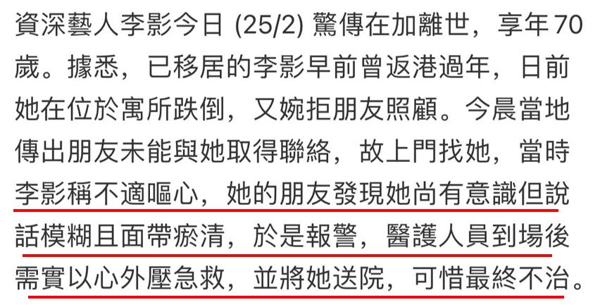 去世的演员叫李影,香港老演员,又一个看名字不认识看脸很熟悉的老戏骨。