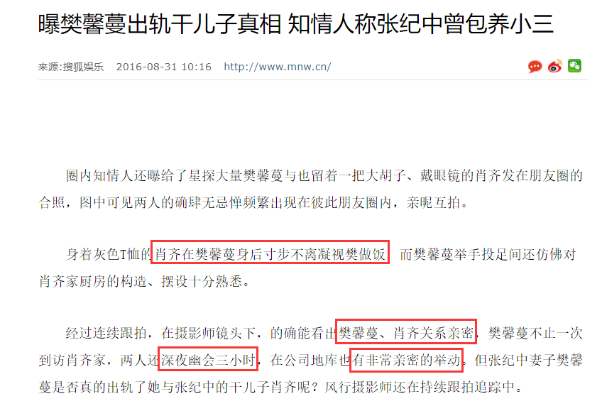 2016年8月份,突然有记者爆料,说樊馨蔓出轨了自己的干儿子。