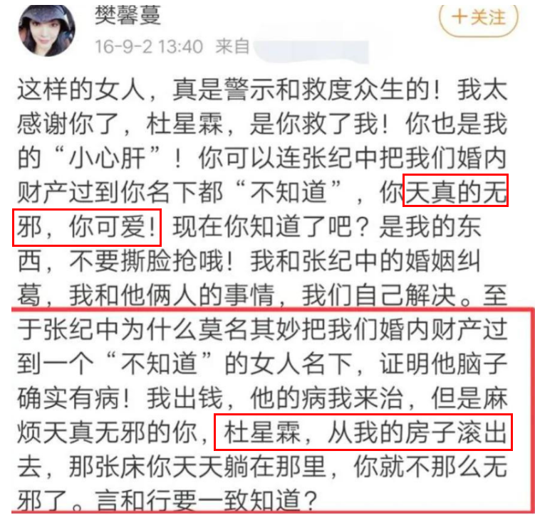 到9月份,樊馨蔓突然在网络发文,指名道姓要杜星霖从自己的房子里滚出去。