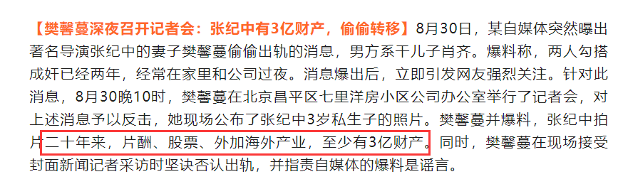 据报道所称,张纪中和樊馨蔓婚后事业顺遂,两人积累下来超过3亿共同财产。