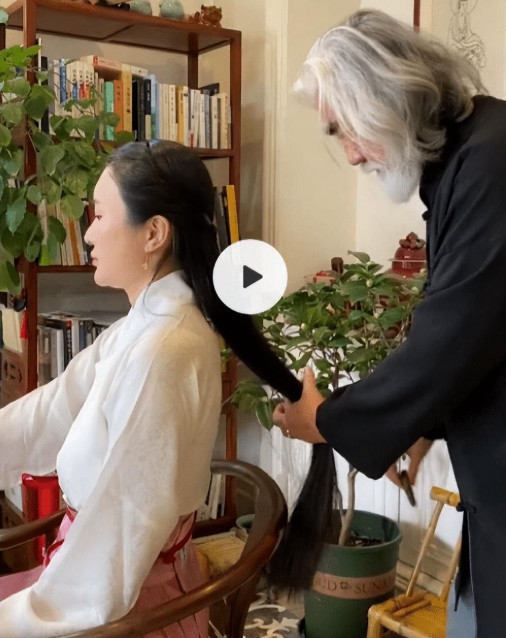 有时,大导演张纪中变成“小”丈夫,为杜星霖梳头发,编辫子;