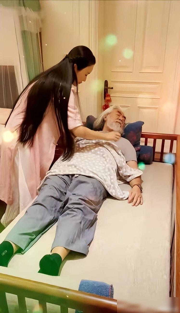 有时,张纪中闭眼躺在床上,杜星霖贴心地为他盖上被子。