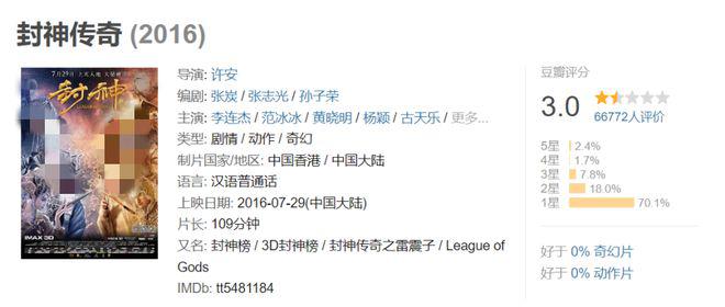 他爸妈给他量身定做电影,请来李连杰等众多大咖,拍出了亏 2 亿,评分 3 分的《封神传奇》。