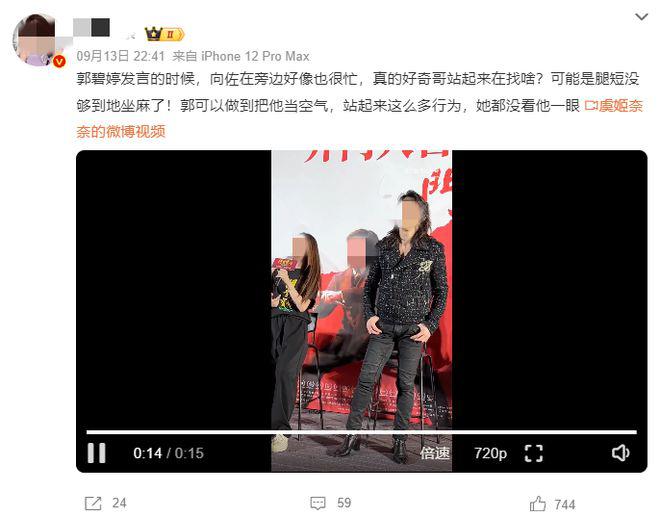 在首映礼上,向佐夫妻俩在宣传电影,向佐想学郭碧婷一样脚放地。