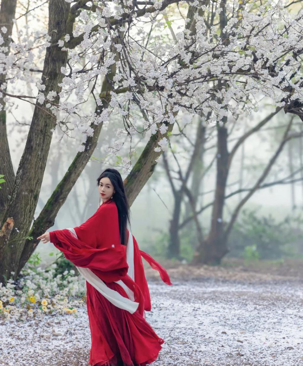 照片中的她,身穿红色衣服,在现场低头看路,其妆容精致,五官立体,肌肤白皙,晶莹剔透,吹弹可破。