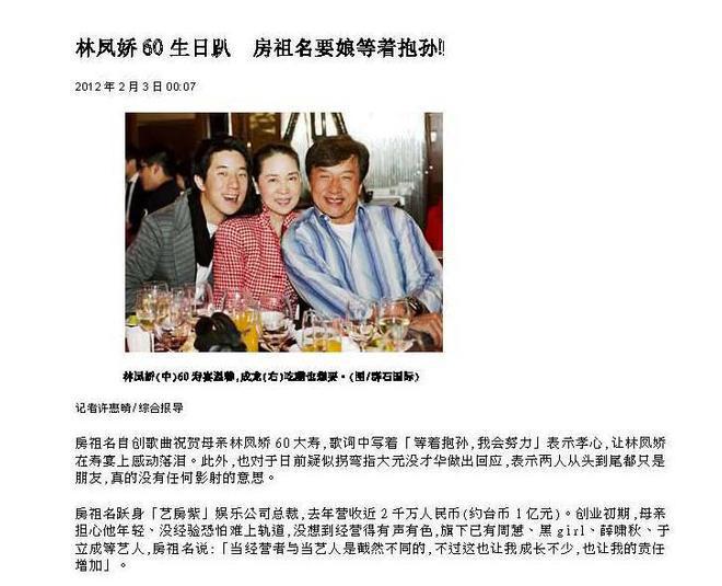 三人一起上台切蛋糕,成龙的脸上流露出一丝小小的嫉妒之情,不禁开口说道,为啥儿子从没有给自己过生日,然后又发言:林凤娇是世界上最幸福的女人,家里有两个男人拼命赚钱 ……