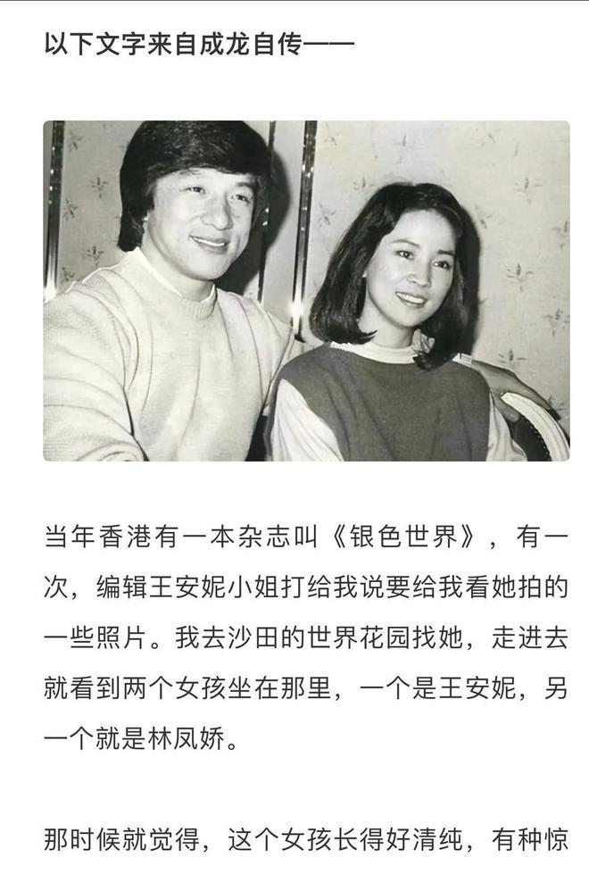 上个世纪八十年代,成龙和邓丽君的绯闻无疾而终,他和义兄秦祥林交好,秦这时在追求另外一位美人林青霞,在一次聚会上,成龙终于见到 " 二林 " 之一的林凤娇,至此一见倾心,在自传中称惊为天人,好漂亮清纯。