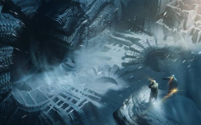 “当我们完全越过那条山隘,看清楚背后究竟有什么东西时,我想我们两个都夹带着畏怯、惊愕甚至是恐惧的情绪同时尖叫了出来,甚至不敢相信自己的眼睛。自然,在那一刻,我们肯定根据自己已有的知识对那个我们所看到的怪诞世界做出了一些自然而寻常的猜测。可能,我们觉得自己看到的那些东西就像是科罗拉多州诸神花园里那些被风化的怪诞红岩;或者像是亚利桑那州沙漠里那些被风琢刻出的、奇妙而对称的巨石。甚至我们仿佛觉得自己只不过看到了一场幻影,就像我们刚飞抵这片疯狂山脉时看到的蜃景一样。事情必当如此!因为当我们的视线扫过那片被风暴刻蚀的无垠高原,并最后牢牢固定在那座由极具几何感的规则巨石阵列所组成的无垠迷宫时,我们必须要为自己找到某些正常、自然的概念可以用来仰赖与退守。然而,我们看到的还只是这座迷宫那耸立着的、破碎坑洼的顶端,它的整体被埋藏在一片巨大的冰盖下——冰层最厚的地方大约有四十或五十英尺厚,而在某些地方则明显要薄得多。——《疯狂山脉》”