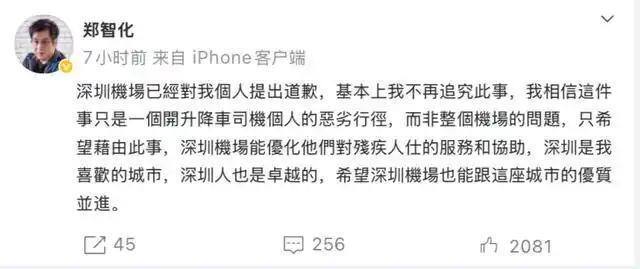 事情起因于10月25日,台湾歌手郑智化在社交平台上发表长文,指责深圳机场服务缺乏人性:升降车与机舱门之间有25厘米的高度差,导致轮椅无法顺利进入,司机态度冷漠,自己不得不“连滚带爬”登机。同为残障人士的歌手李琛随即发声支持,网友们纷纷批评机场,负面情绪蔓延。