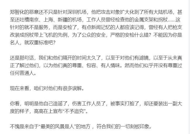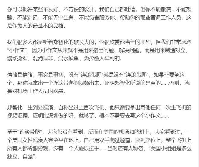 更引人关注的是郑智化的回应。机场道歉后,他声明不再追究,将责任归咎于个别司机的行为。不久后他又发布了一篇长文,提及南京、上海、新疆等地机场的服务问题,如南京要检查轮椅金属支架,新疆要求托运拐杖,上海安检时间过长差点误机,直指这些地方缺乏同理心。