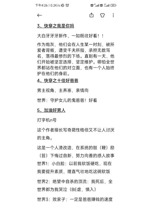 1、综穿类如:综穿百味人生、综用生命刷存在感的男人、综身残志坚等,展现多元故事。爸爸类如:全能奶爸、好爸爸系统、快穿之做个好爸爸,聚焦平凡父亲角色。渣男类如:我不是渣男、我是渣男快穿、我真不是渣男、渣男洗白手册,探讨角色成长与洗白。