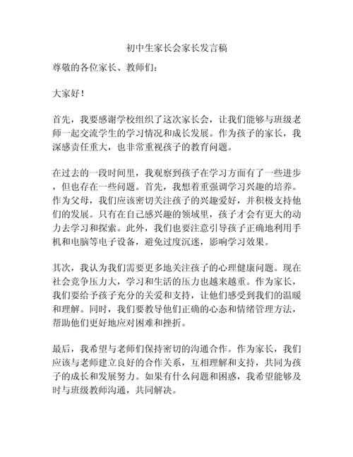 2、初中家长会发言稿简短如下:各位老师、各位家长,大家好:我是***的家长,很荣幸能在今天的家长会上与大家交流。以下是我关于孩子教育的一些简短分享:孩子的学习表现 在这学期的期中考试中取得了不错的成绩,排名比较靠前。 这是老师和她本人共同努力的结果,作为家长,我深感欣慰。