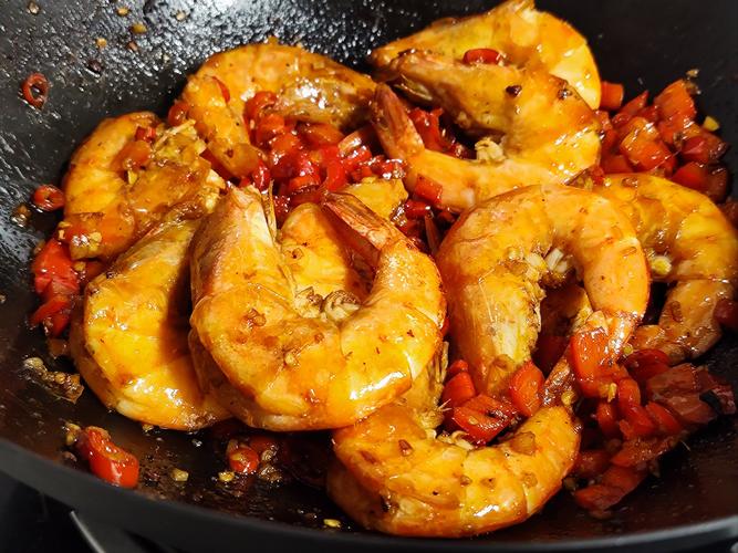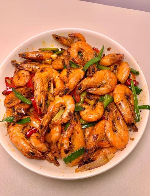3、翻炒虾:待油温达到适宜程度后,先倒入虾进行翻炒。虾肉易熟,翻炒时可以观察其颜色变化,由透明逐渐变为粉红色,表示虾肉正在逐渐熟化。加入辣椒和洋葱:当虾翻炒至七八分熟时,倒入切好的辣椒和洋葱继续翻炒。
