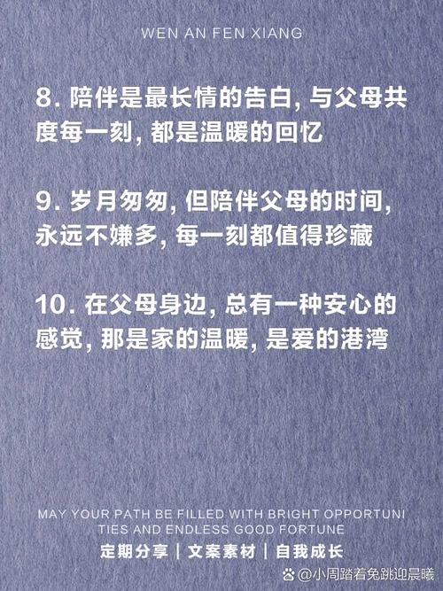 陪伴是最长情的告白,感谢父母一直以来的关爱和支持。父母在,人生尚有来处;父母去,人生只剩归途。愿我们珍惜和父母相处的时光。陪伴父母,让他们感受到我们的爱和关心,也是一种孝顺的表现。父母在,不远游。感谢父母一直陪伴着我们,让我们有家的感觉。