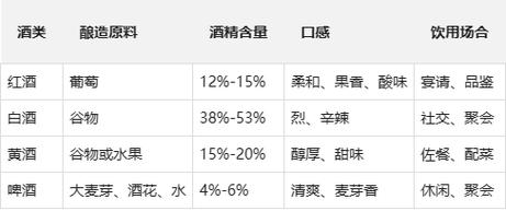 红酒和啤酒的主要原料不同。红酒主要以葡萄或其他水果为原料,而啤酒则以麦芽、啤酒花为主要原料,白酒则以谷物类为主。在成分上,红酒含有水分、酒精和多种微量物质,如维生素、酒酸、果性、矿物质和单宁酸等。啤酒中含有酒精、糖类、糊精、蛋白质、维生素、无机盐类、二氧化碳等。